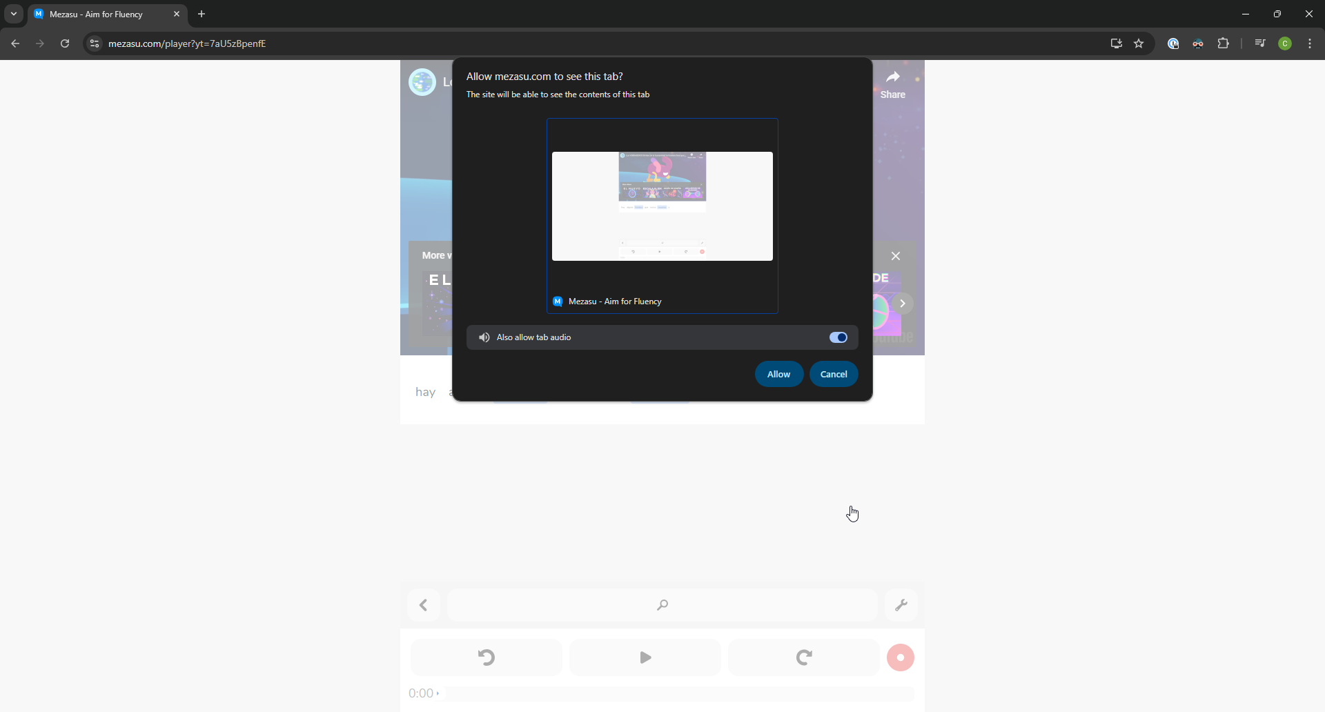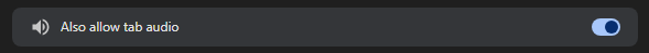 Make sure “Also allow tab audio” is turned on – recording won’t work without this on.